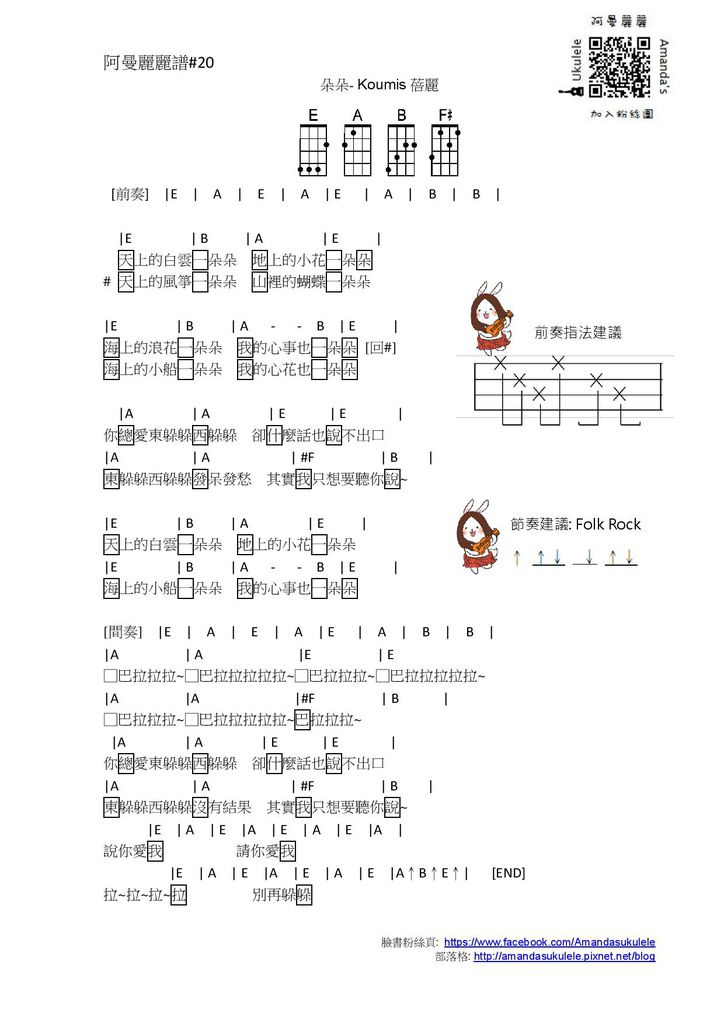 最近這兩天有位創作才女隕落了-- Koumis蓓麗,我對蓓麗的認識其實是在我接觸了烏克麗麗之後,因為這首歌- 朵朵,一大早起來阿曼在恬靜的早晨中,聽著朵朵,把譜打完。謝謝妳寫了這麼首清新快樂的歌曲,為許多人心中帶來朵朵的歡喜,R.I.P. Koumis蓓麗