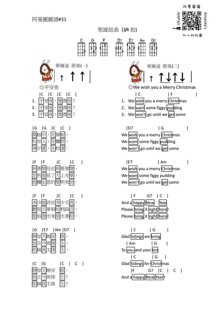 我最愛的聖誕節要來了!! 因為阿曼最愛唱聖誕歌了,嘻嘻,平安夜和we wish you a merry christmas是很經典的聖誕歌曲,而且剛好都是3拍的歌曲! 可以連起來當組曲來唱,平安夜C調Key若太高可以轉成F調唷,快拿起烏克來歡唱吧!