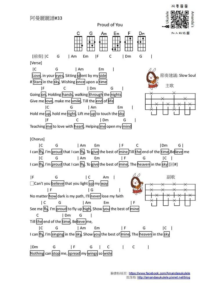 揮著翅膀的女孩- Proud of You,這首也是經典無敵八和弦的歌曲,節奏上可以搭配Slow Soul的指法與節奏來變化,增加、推疊這首歌的情緒