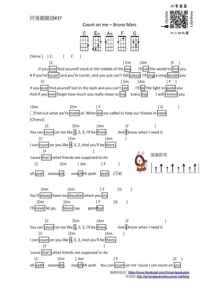 You can count on me~ like 1 2 3 ~ I'll be there~ 輕鬆的曲風,來自Bruno Mars,Bruno Mars有許多歌曲都很適合用烏克麗麗彈唱,而且都很朗朗上口,大家可以試試看唷^^
