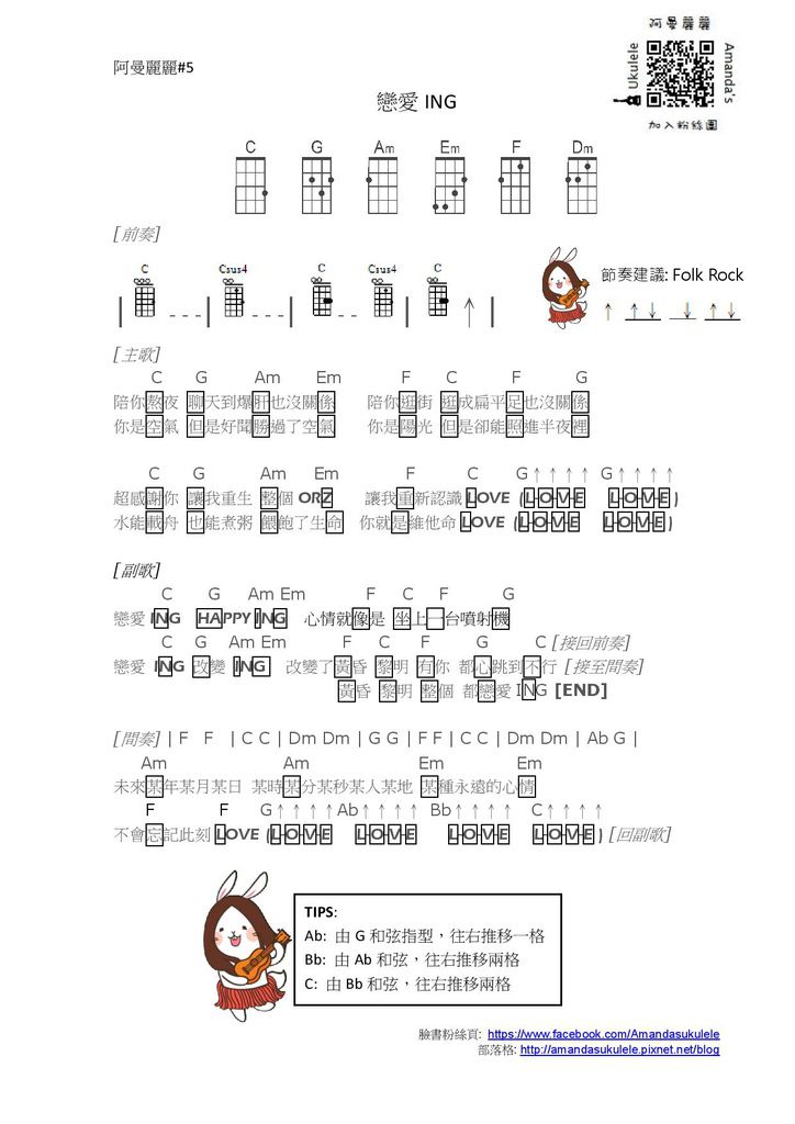 烏克麗麗Folk Rolk的必學曲- 戀愛ING,有一陣子幾乎是各大烏克盛會的大合唱必備曲,主旋律的和弦 | C | G | Am | Em | F | C | F | G | 的循環,也是非常常見的和弦進行 (EX: 卡農C大調),這麼歡樂易學的歌曲,大家快點兒來學,和朋友們一起來歡唱吧 :D